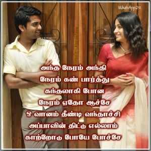 நீதானே நீதானே என் நெஞ்சை தட்டும் சத்தம் அழகாய் உடைந்தேன் நீயே அர்த்தம். என் மாலை வானம் மொத்தம் இருள் பூசிக்கொள்ளும் சத்தம் இங்கு நீயும் நானும் மட்டும் இது கவிதையோ...!